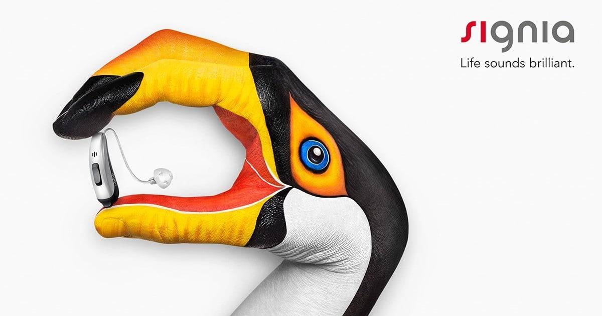 Tukan olarak boyanmış bir el, başparmağı ve parmağı arasında modern bir Signia Pure 312 Nx işitme cihazı tutuyor. Sağ üst köşede Signia logosu ve “Life sounds brilliant.” sloganı görünüyor.